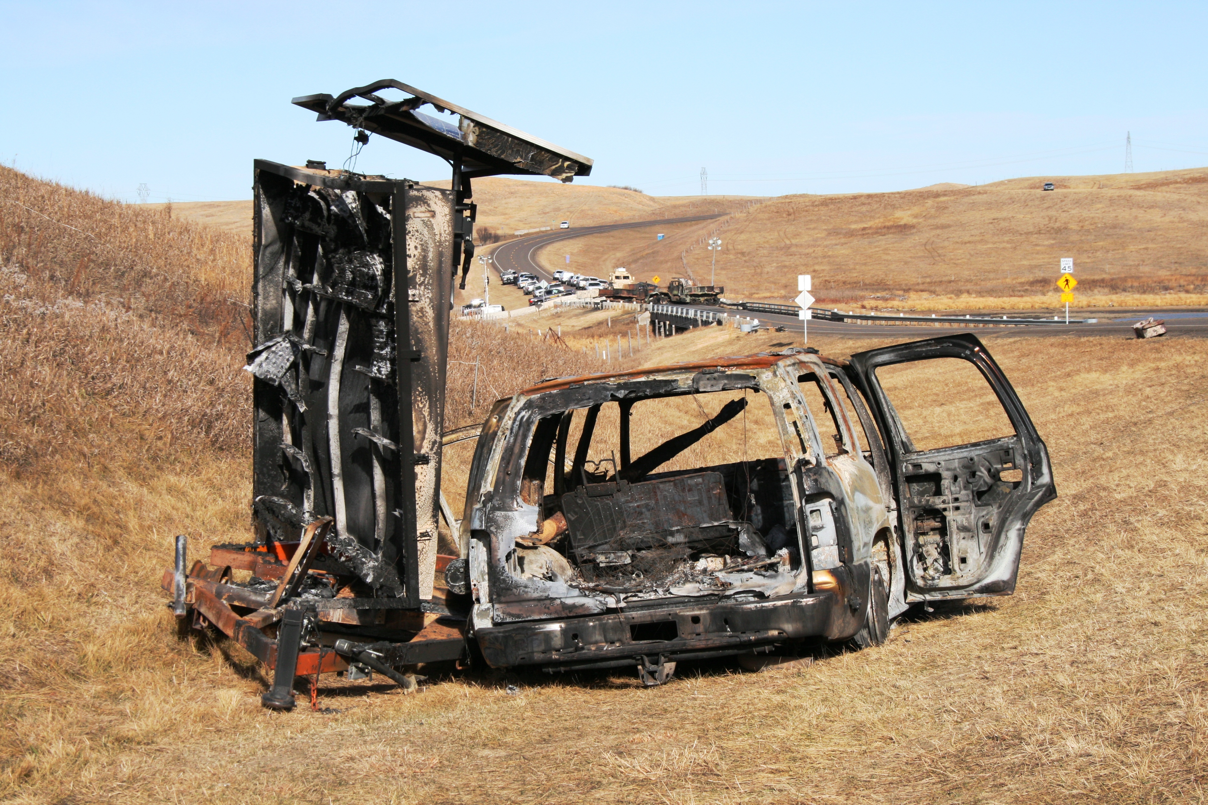 The remains of a car and solar panel remain on site after Morton County law enforcement assaulted and decimated the North Treaty Camp on October 27, 2016, arresting hundreds and permanently blocking the only direct route from Cannonball ND to Mandan/Bismark, and the closest hospitals.