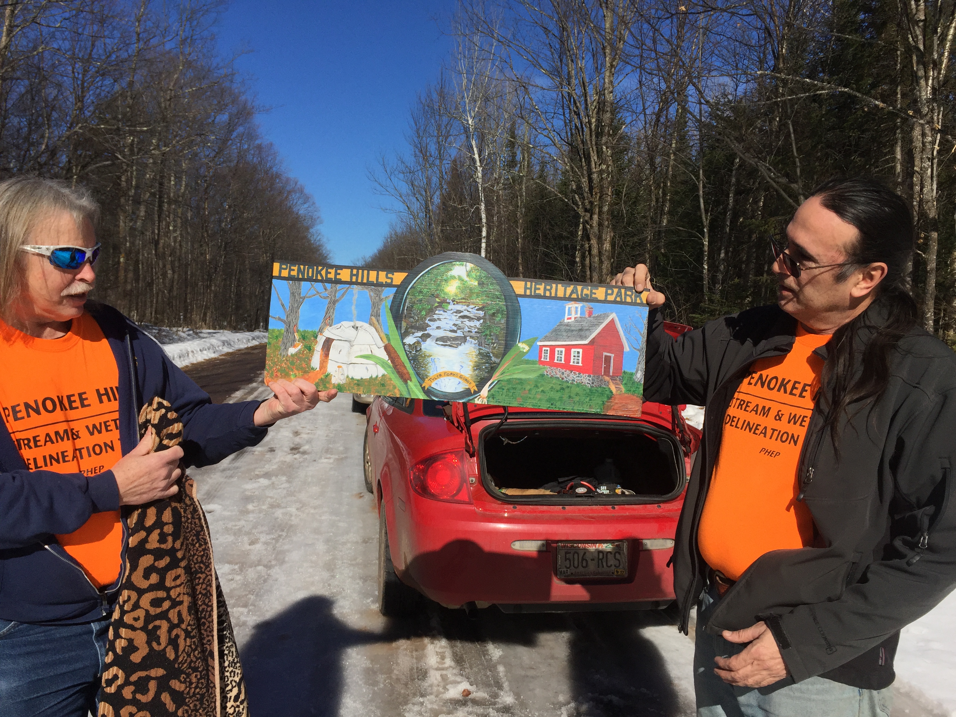 Greggory Jennings shows off a new sign he created for the Penokee Hills Heritage Park Facebook Page, with Paul DeMain.
