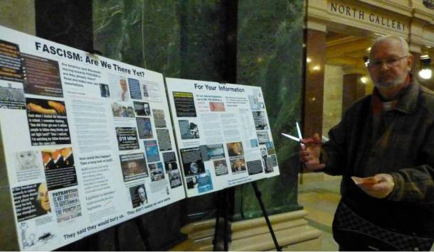 The signs he often held at the noontime Solidarity Sing Along (now at 1,663 straight weekdays) evolved into larger displays mounted on foam core and placed on a tripod on the Capitol rotunda’s first floor after permits were received. Fliers attached to a tripod and easel summarize the display and invite people to take a copy (but not the whole sign!).