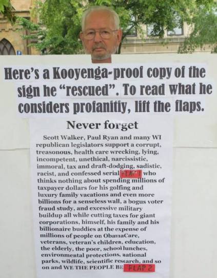 The Brookfield Patch, in Kooyenga’s back yard, was alone in noting this irony in its story headlined “Free Speech Bill Sponsor Caught Stealing Anti-GOP Sign.”