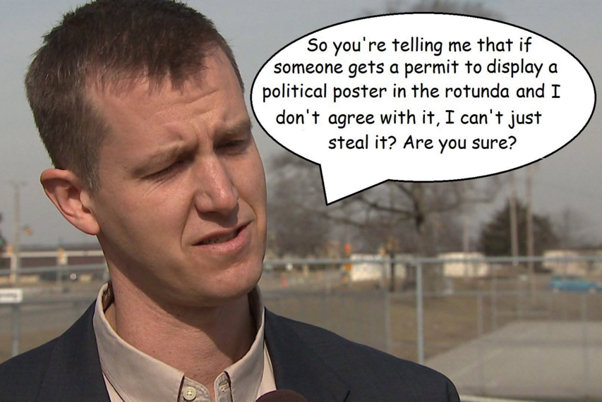 The Brookfield Patch, in Kooyenga’s back yard, was alone in noting this irony in its story headlined “Free Speech Bill Sponsor Caught Stealing Anti-GOP Sign.”