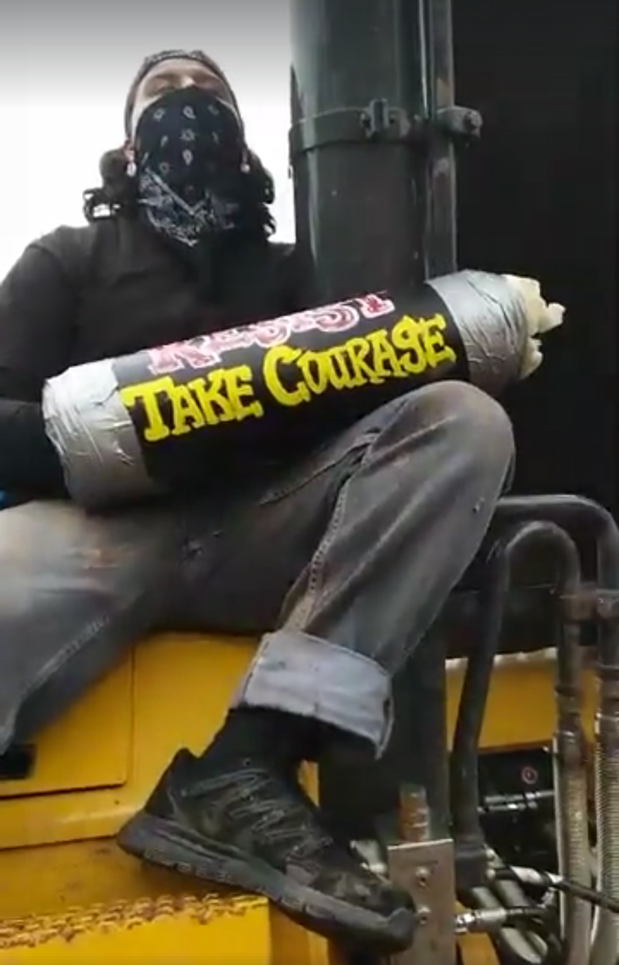 Alexander Good-Cane-Milk (Yankton Sioux tribe) locked down to construction equipment before his arrest. Photo from livestream by Neo Gabo Benais