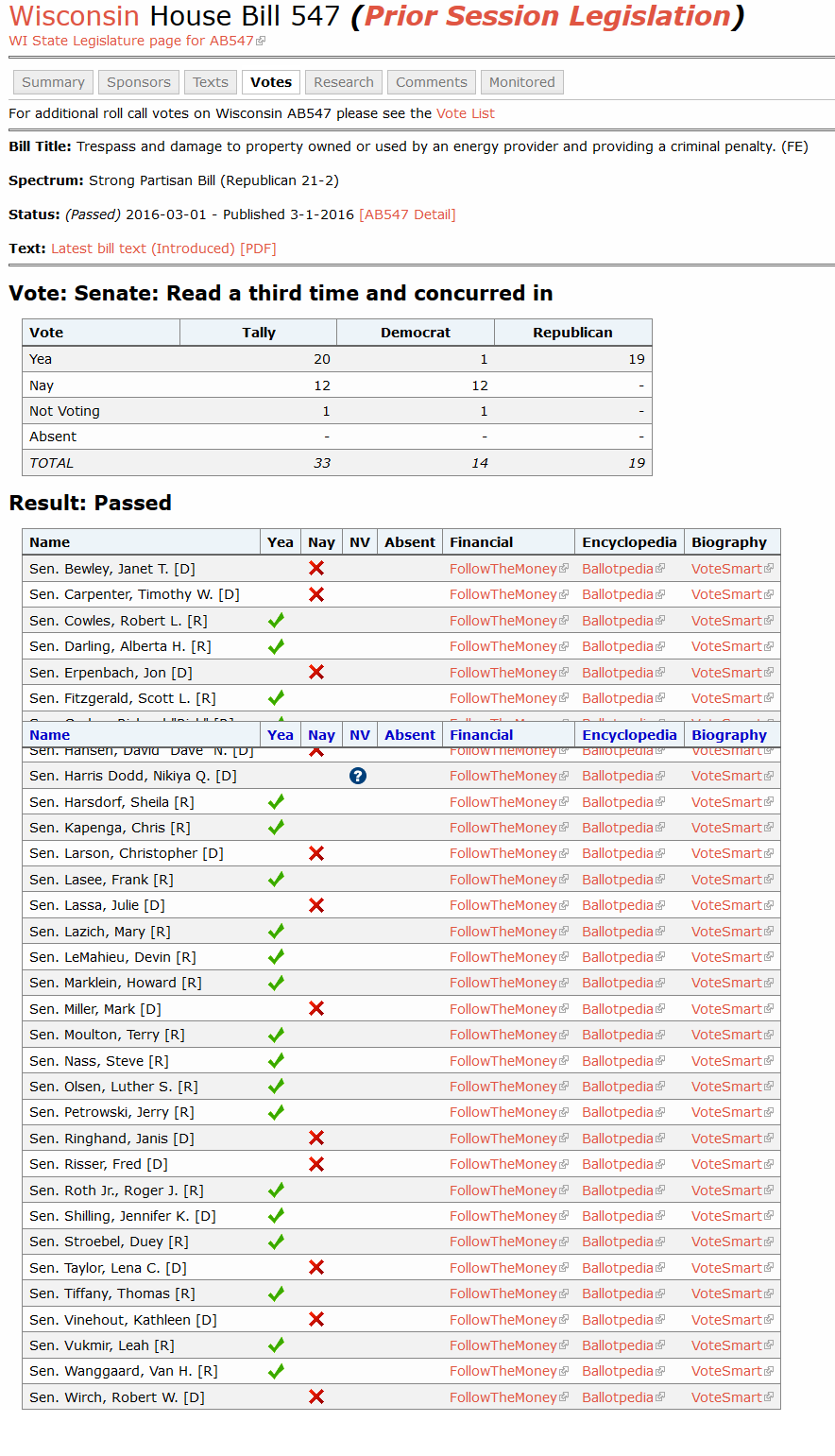 Bewley’s bill allows for any person on a “utility’s” land—whether on a pipeline easement route or an office building/headquarters—to be charged with a felony. Much like at Standing Rock, the corporations will be able to falsely claim that the peaceful protestors are harming the pipeline. Because the foreign for-profit energy corporations would now be considered “public Wisconsin utilities,” the door opens for Enbridge—even while operating illegally in northern Wisconsin—to legally use local law enforcement to arrest and criminalize protestors exercising First Amendment protected rights. The cost of that law enforcement will now fall to the people. This successfully eliminates the $15,000,000 pay off ETP had to make to Morton County.