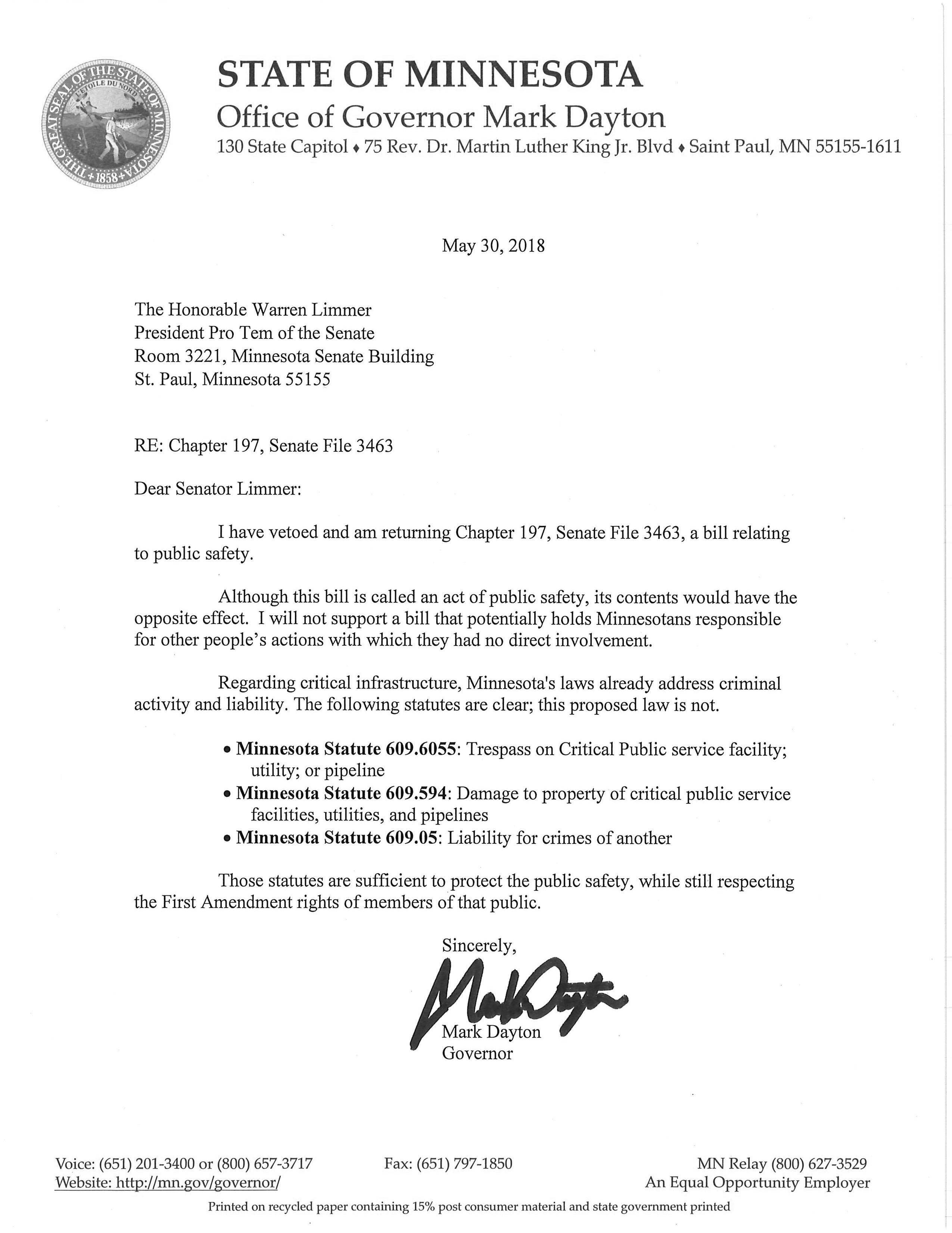 10 Office of the Governor, Veto Letter of Ch. 197, Senate File 3463, May 30, 2018, http://mn.gov/govstat/pdf/2018_05_30_LETTER_VETO_Letter_Infrastructure_Protest_Bill.pdf.