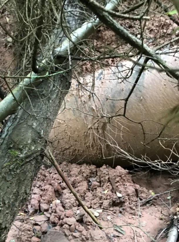 Photo of 25-40 feet of Enbridge Line 5 pipe unsupported and exposed to the elements at the Denomie Creek tributaries on the Bad River Reservation. SC386 will make it a felony for water protectors to protest on Enbridge easements. The Bad River Band is suing Enbridge to shut down Line 5 and remove their pipelines. Bewley refuses to denounce Enbridge and stand up to protect the water.