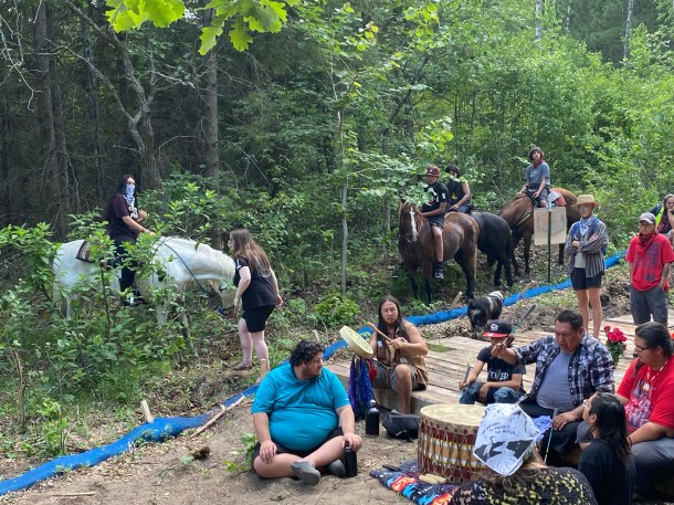 Dakota Sundancer Hoka Wicasa leads the protectors in a song as they occupy the Enbridge easement on the Shell River. Photo: Barbara Ryman
