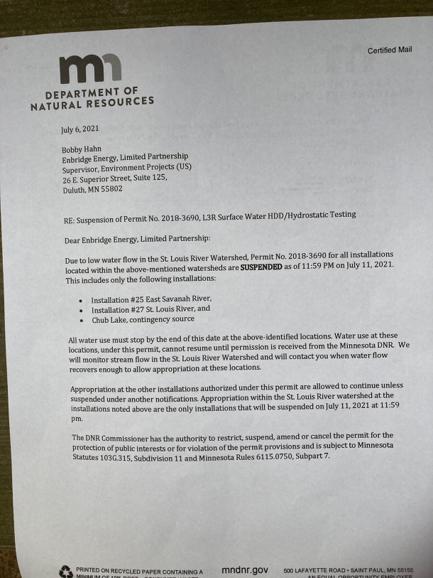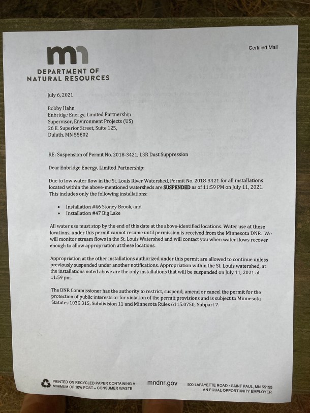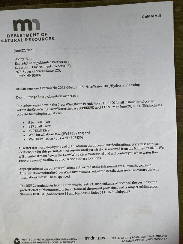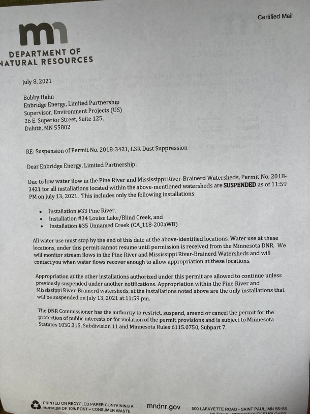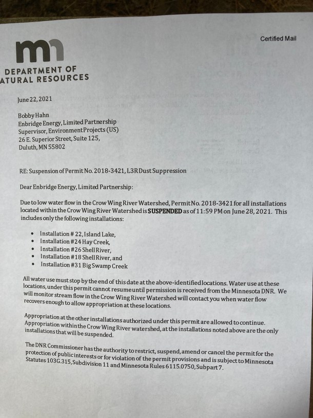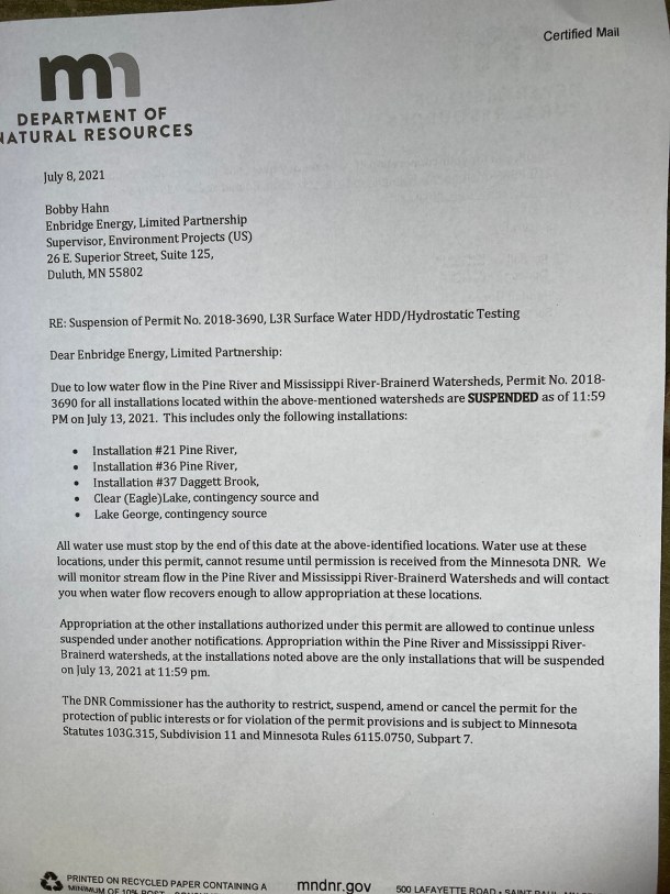 On Friday, July 16, the Minnesota DNR released copies of the suspension of permits issued to Enbridge as early as June 22, including suspending their permits in the Mississippi River-Brainerd, Pine River, St. Louis, and Crow Wing watersheds.