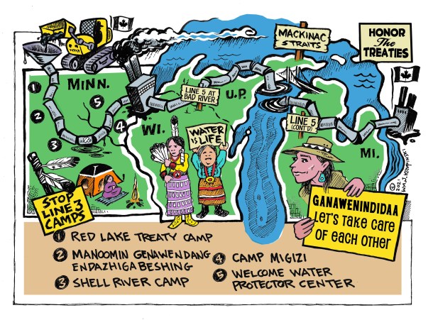 In Madison the giige collective is organizing support for some of the Line 3 camps with which they are in direct contact. Those interested in donating funds can do so at their PayPal account. They also travel to and from camps and can take donated items. Contact them at gigiigemin@giige.co for more information.