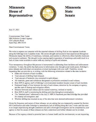 On July 27, a group of Minnesota State Legislators sent a letter to the Minnesota Pollution Control Agency asking them to temporarily suspend the Section 401 certification and demand that Enbridge halt all drilling along Line 3 after nine separate incidents of toxic chemicals being release into the waters all across the line.