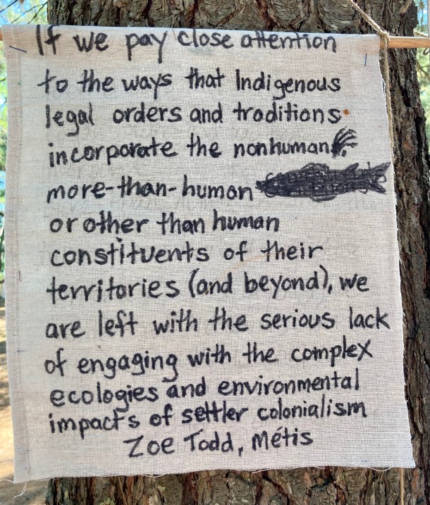 This is not a poetic, romantic gaze. All of us, as treaty people, literally need to center our more-than-human constituents as political agents in their own right while acknowledging the impacts of on-going settler colonialism, what Candace Fujikane calls the “developer tactics to wasteland the earth.” Our non-human allies continue to be harmed by this predatory extractivism. Rights of nature reinstate more-than-human autonomy and prevent wastelanding, which is always disproportionately adjacent to Indigenous, black, people of color, and low-income communities.