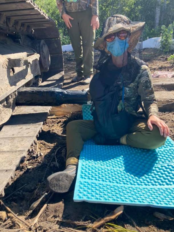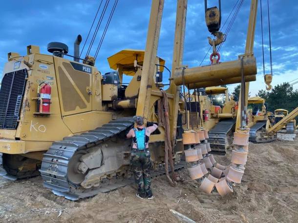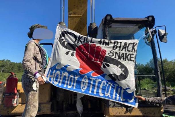 Another excavator at a different worksite was also stopped and locked to by a pair of Water Protectors. “We have to stop the destruction! Even after the recent frac-outs along the HDD sites and use of less-lethal force by police paid by Enbridge, Walz and Biden remain silent. So we take our power back today and challenge the systems that have failed us all.”