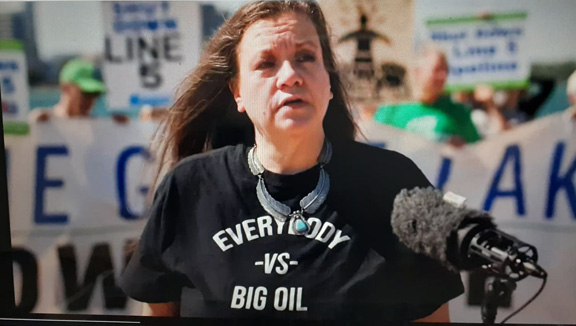 In her message, Gasco-Bentley stated, “Line 5 poses an immediate threat to our Anishinaabek homeland. This water in the Straits nourishes our people. It provides critical habitat for our fish and medicines. We depend on healthy clean water to feed our communities. We know the Enbridge pipeline leak in the Kalamazoo River has been devastating to escosystem of the river and the tributaries. We must continue on a path to make people realize the vision we want: Safe water for our next seven generations. Women, I call on you. We are the water protectors, and we must stand together. Water must be protected. It’s time to shut down Line 5.”