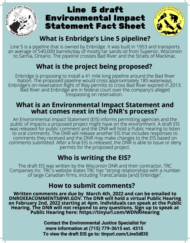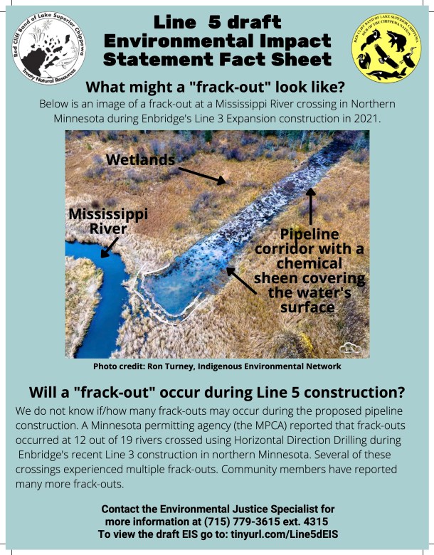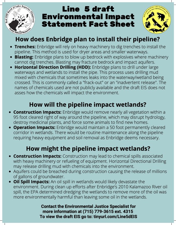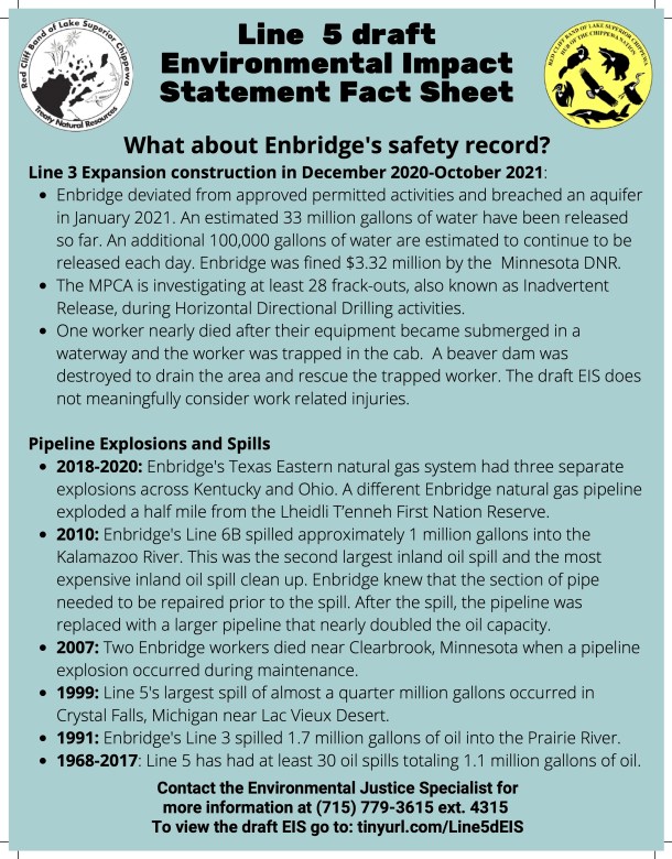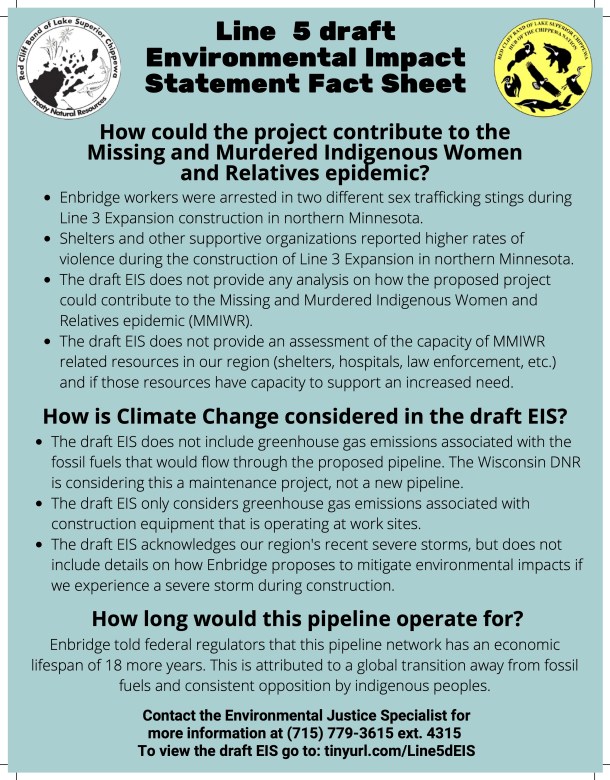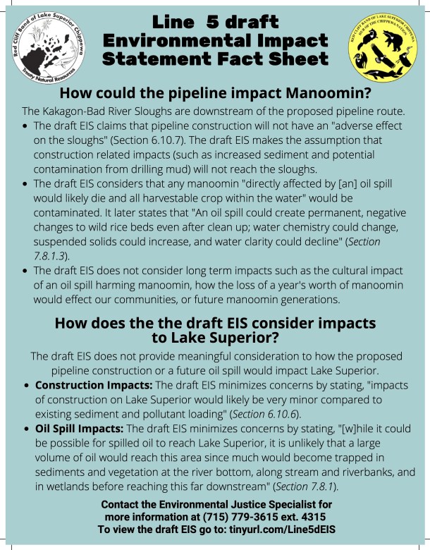 Red Cliff Band of Lake Superior Ojibwe have released a Fact Sheet concerning the Enbridge draft Environmental Impact Statement concerning Line 5 through the Penokee Hills.