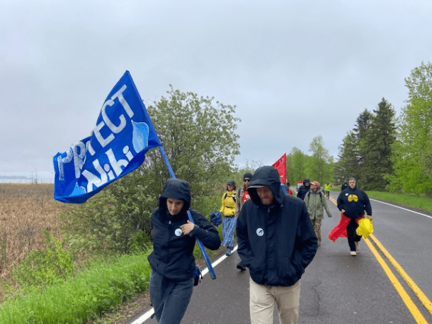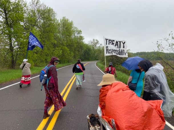 Led by indigenous women from Miskwaagamiiwi-Zaagaiganing (Red Lake) and Gaa-waabaabiganikaag (White Earth) in Minnesota, and Basaabikaang (Red Cliff) and Mashkiiziibii (Bad River) in Wisconsin, the walkers are accompanied by allies. To join up at any point with walkers or offer support, call the Treaty Walkers. Ashley: 952-923-7334.