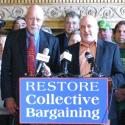 March 8, 2012 by WCMC Today Rep. Mark Pocan and Sen. Fred Risser announced plans to restore collective bargaining rights. The Collective Bargaining Restoration Act (Assembly Bill 338/Senate Bill 233) would repeal the anti-union provisions passed with Wisconsin Act 10 one year ago. “The Republican attack on our public employees is the single most […]